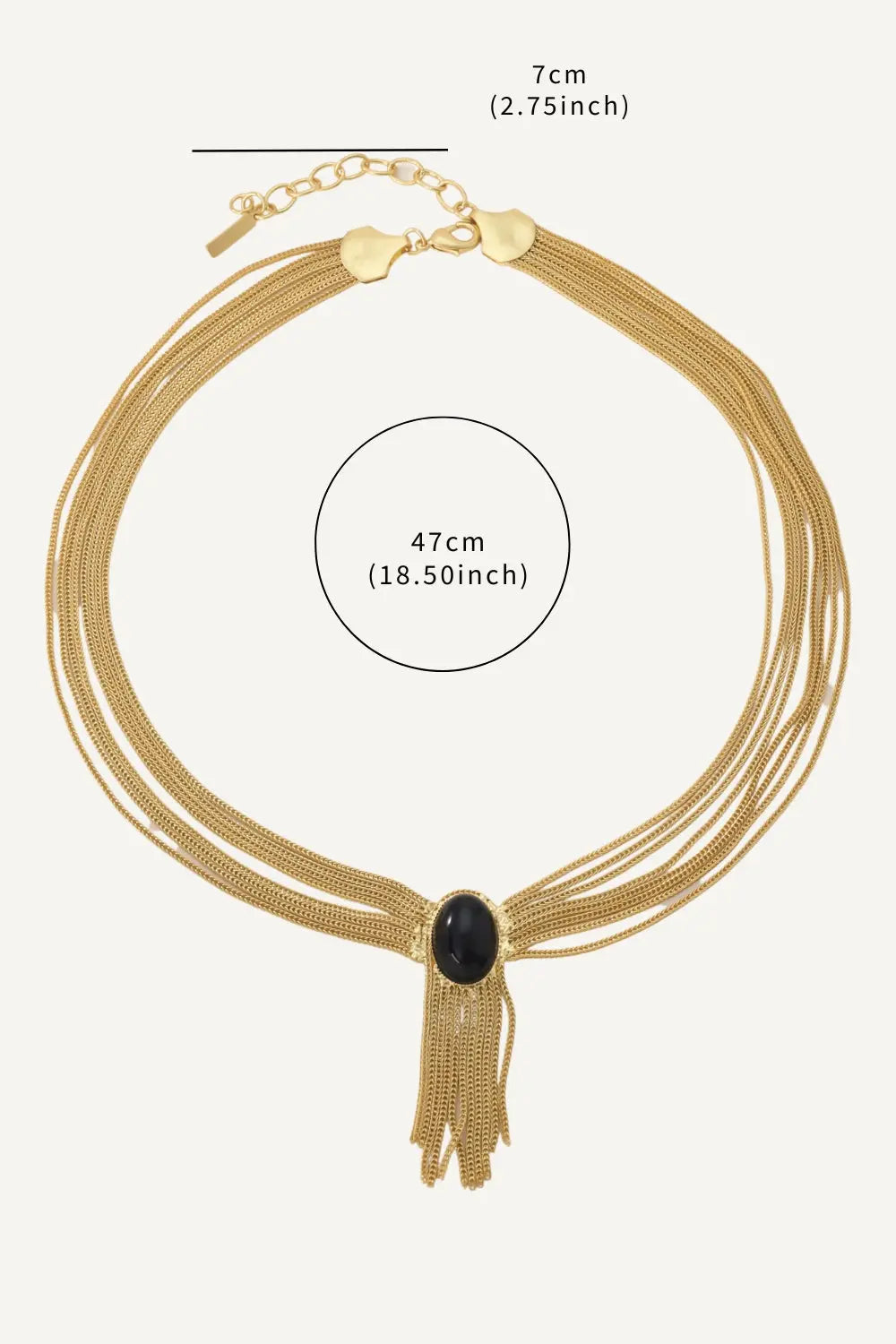 The Eclipse Layered Necklace offers a sophisticated blend of modern elegance and vintage-inspired design. Featuring eight luxurious 18K gold-plated chains, this necklace exudes timeless beauty, while the handcrafted glass pendants add a touch of artisanal craftsmanship. Available in three stunning colors – red, green, and black – each pendant captures a unique and captivating hue, making this necklace perfect for every occasion.
