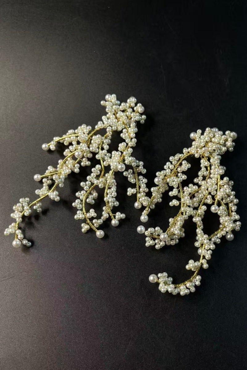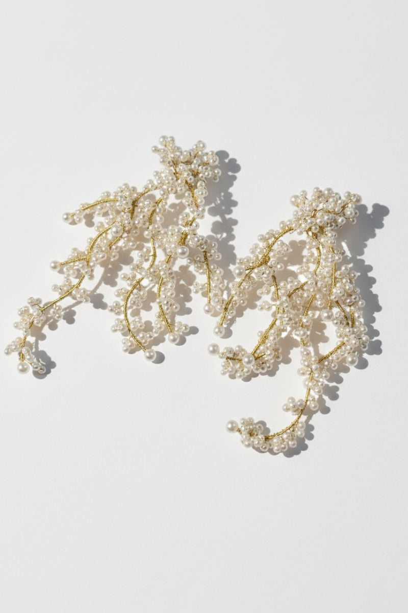 Our Elysian Fluid Pearl Drops feature high-luster quality shell pearls suspended from molten-effect 18K gold-plated brass settings. The organic, irregular metalwork creates a stunning contrast against the creamy smoothness of the pearl, making these earrings a true piece of wearable art.